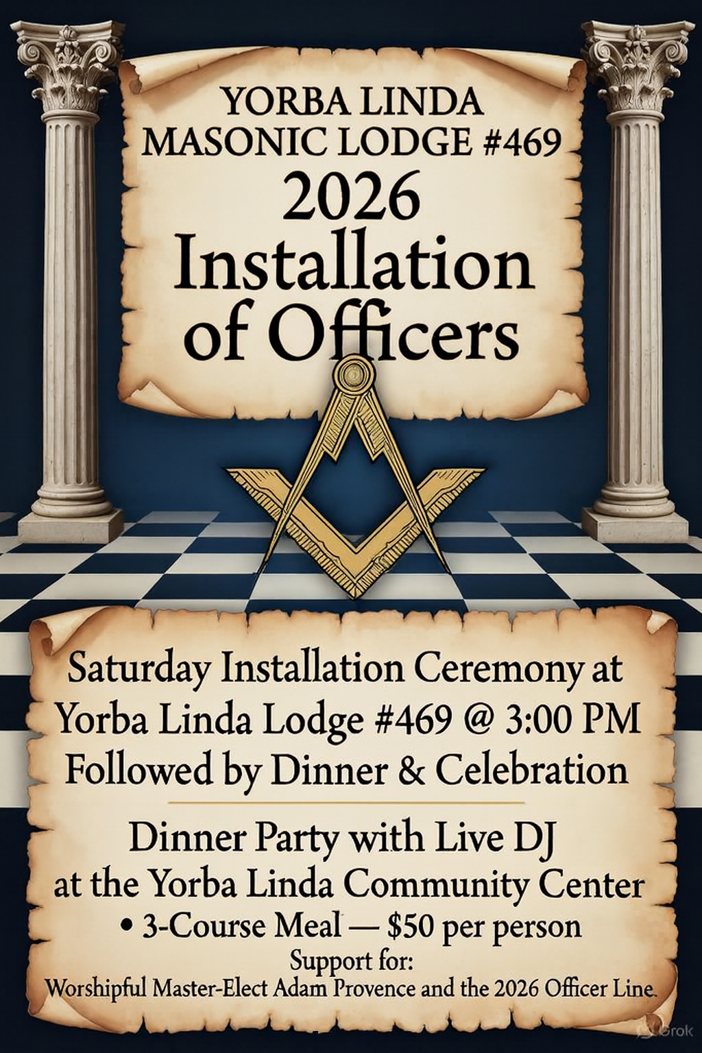 Dinner at 7 PM at the Yorba Linda Masonic Lodge #469